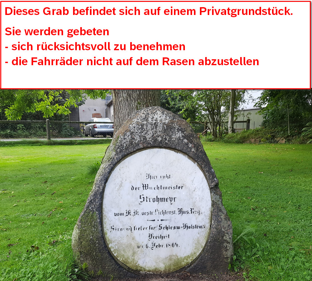 Hier ruht der Wachtmeister Strohmeyr des österreichischen Husaren-Regiment. Er starb durch die dänische Nachhut, die den Rückzug der Dänischen Truppen die das Dannewerk und Schleswig ohne Kampf verlassen hatten sichern sollten. Um sich hinter den Düppeler Schanzen zurück zu ziehen. Er starb am 06.02.1864 um 4 Uhr nachts. Bis heute wird von der österreichischen Seite das Grab gepflegt und in Stand gehalten.